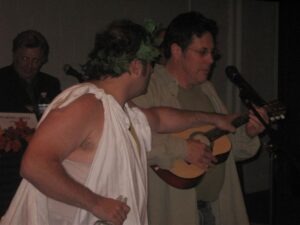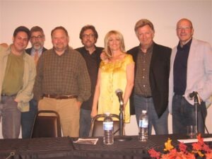 August 2008: Robert produces the 30th Anniversary Class Reunion of National Lampoon’s Animal House at Jeffrey Gordon’s Writers Boot Camp in Santa Monica. Director John Landis is there, along with Stephen Bishop (Guy on Stairs), Stephen Furst (Flounder), Martha Smith (Babs) and Chris Miller (Hardbar) who not only cameo’d in the movie but co-wrote it with Harold Ramis and Doug Kenney. The movie was based upon Chris Miller’s amazing essays about his Dartmouth fraternity days which were initially published in The National Lampoon and are now iconic. Stephen Bishop turned down an offer to have Belushi impersonator Mitch Berlow re-enact the smashing of his guitar while Bish sings “The Riddle Song”—so emcee/producer Robert did the honors. The crowd went wild and the entire night was covered by Gawker.
