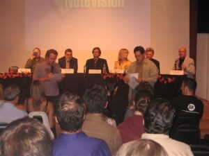 Red Carpet role call L-R: WCs Peter Trivelas, Pablo Agrio, Elaine Little (whose story was read by Sharon Stone), rmf, Gentle Culpepper, Mark Castro and Mat Ray Von. |