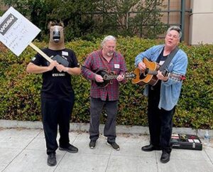 June-July 2023: Robert, a WGA and SAG-AFTRA busking rousing songs of Union Solidarność on picket lines around LA with legendary studio sideman folk-brother John O’Kennedy on mandolin.