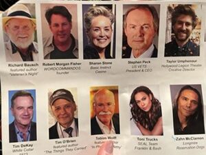 March 2023: Three of Robert’s UCLA Wordcommandos (known as The Seal Team Six of Veteran Writing Workshops) were honored by WordTheatre in Hollywood at a sold-out Salute to Veteran Writers featuring A-list actors such as Sharon Stone, John Savage, Griffin Dunne, Bill Pullman and many others reading their work at the 400-seat Post 43 Theater. They were honored alongside famous veteran/writers Tobias Wolff, Richard Bausch and Tim O’Brien. John Savage was so wound up by his reading of Tom Bird’s memoir excerpt (a MS which Robert edited, btw—he helped Cedering Fox curate the entire show) that they talked for an hour afterwards about everything from The Deer Hunter to Milos Forman’s Hair — both of which John starred in. Gentle Culpepper sat alongside fellow Vietnam combat veteran and Special Forces soldier Tobias Wolff during the riveting performances where legendary actors tried to outdo each other. It was that kind of night.